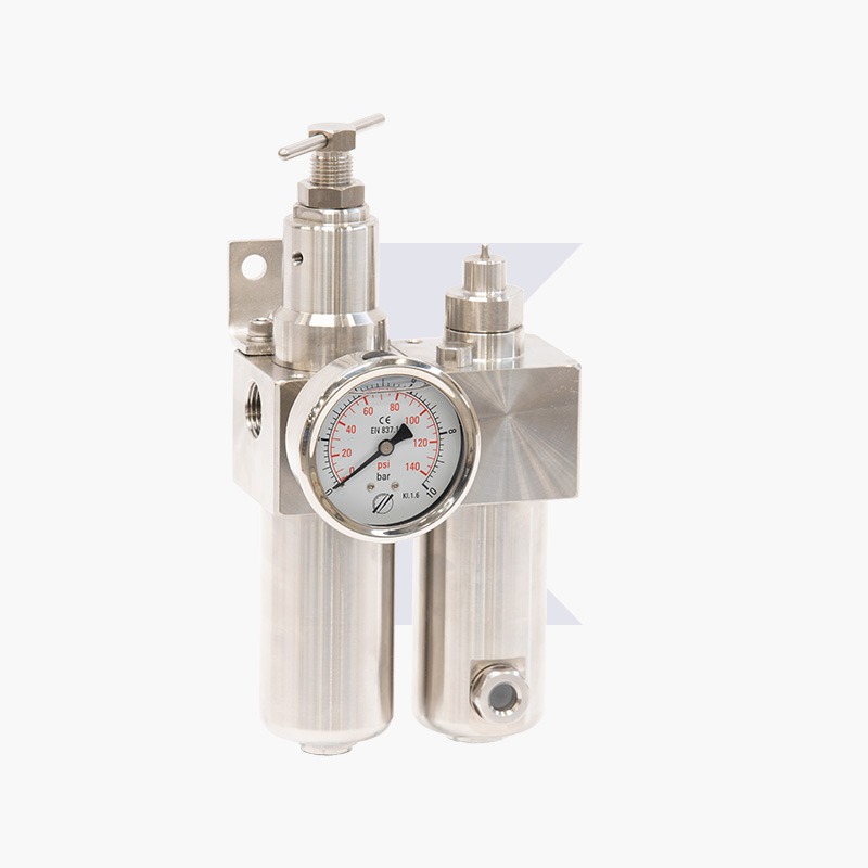 Le FRL inox de notre gamme Traitement de l’air permet de réguler la pression d’air sur des équipements et d’en optimiser la consommation. Les variations de température engendre de la condensation sur les circuits : l’ajout local d’un filtre diminue le risque de corrosion dans les éléments des machines.